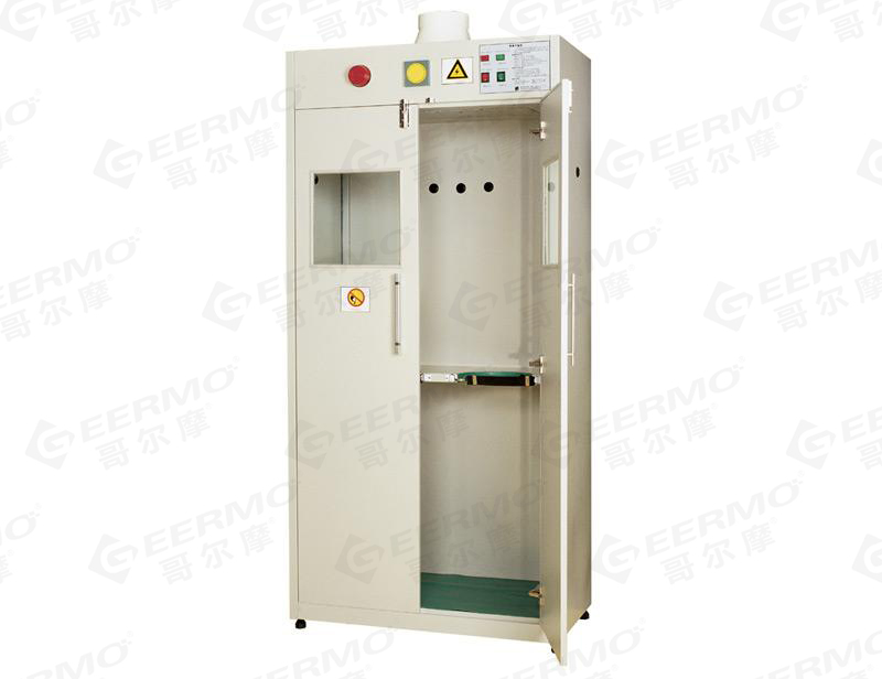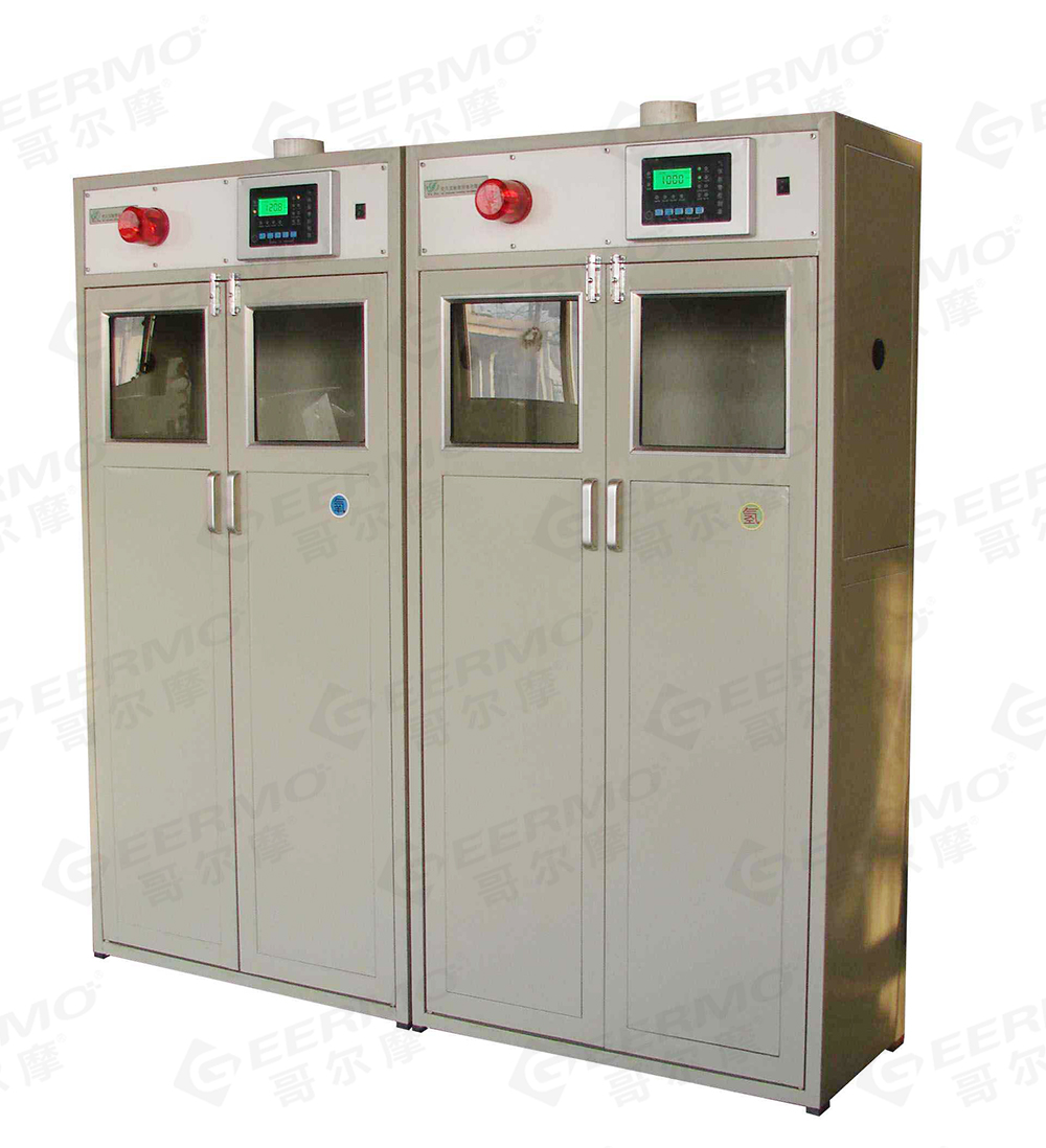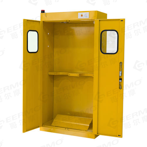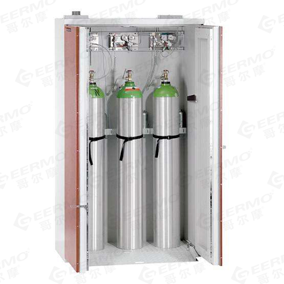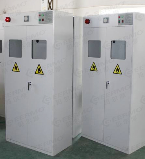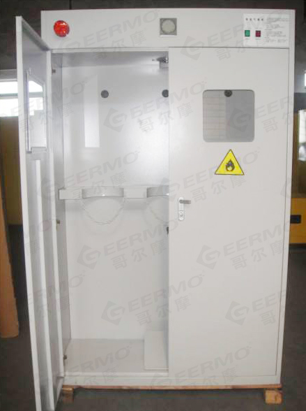 2.報警型氣瓶柜:專為存放可燃氣體而設計的。頂部增加了可燃氣體泄漏報警裝置。傳感器如檢測到可燃氣體泄漏,將會發出聲音和燈光報警,同時啟動頂風機排風。