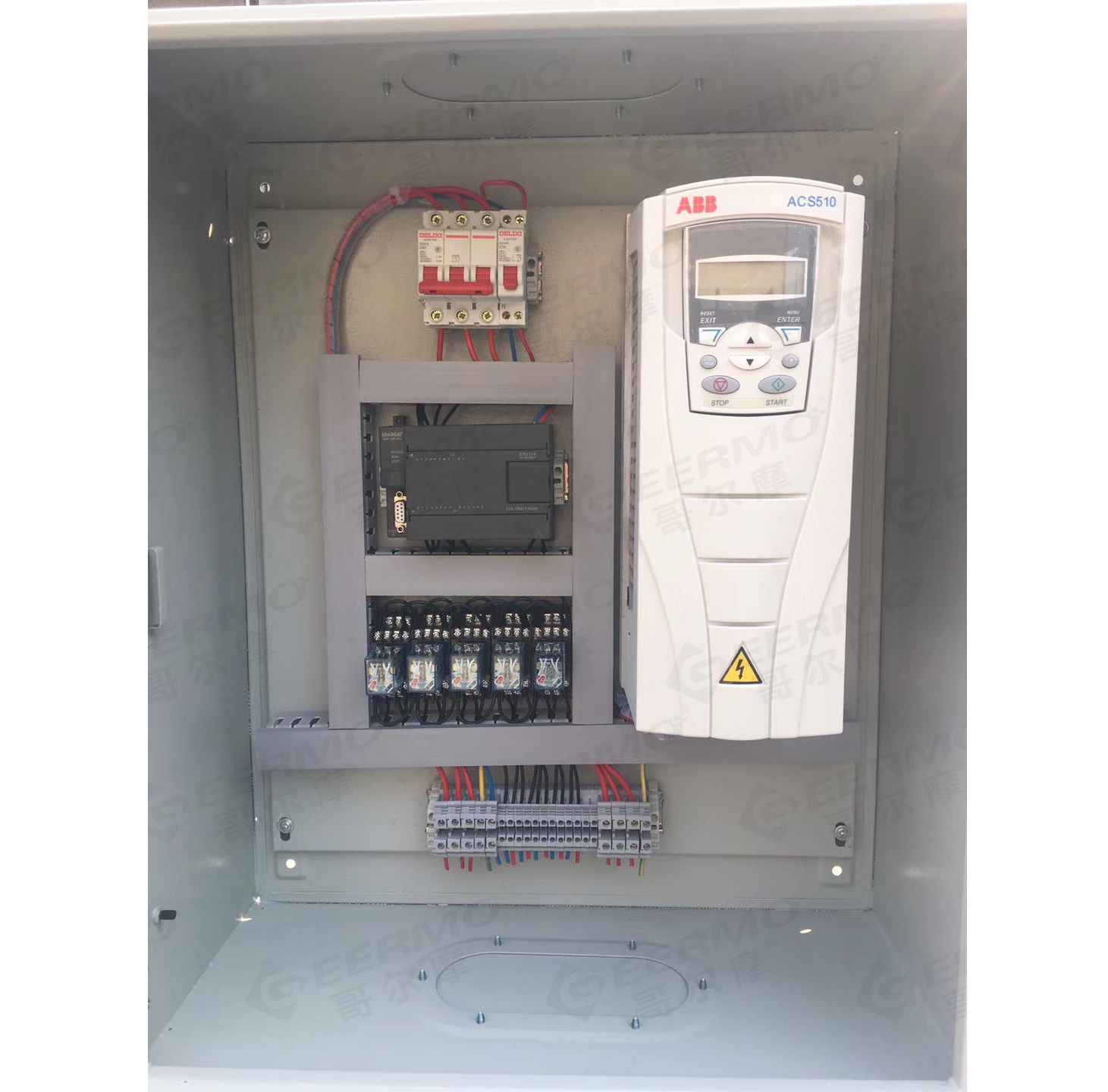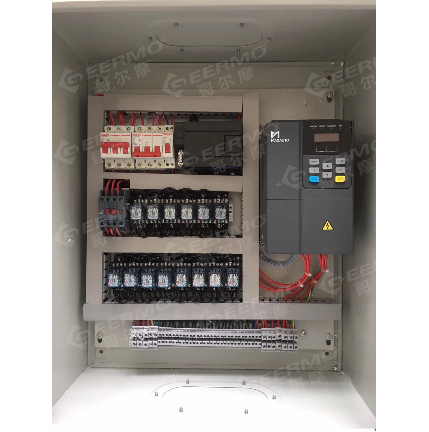 實現功能:例如:有三層樓宇,每層有三臺通風柜,準備在樓頂裝一臺8號風機,采用變頻器調速。一般來說,控制變頻器只能在一處,樓下用風要跑到樓上去調,這樣很不方便,也不現實。采用本智能控制器后,可以在每一臺通風柜上單獨控制。達到每開一臺通風柜,風機增加一檔風量,再開一臺通風柜,風量又增加一檔,以至全開時,風量達到*大;同樣,每關閉一臺通風柜,風量減少一檔,全部關閉時風機停止運行的效果。